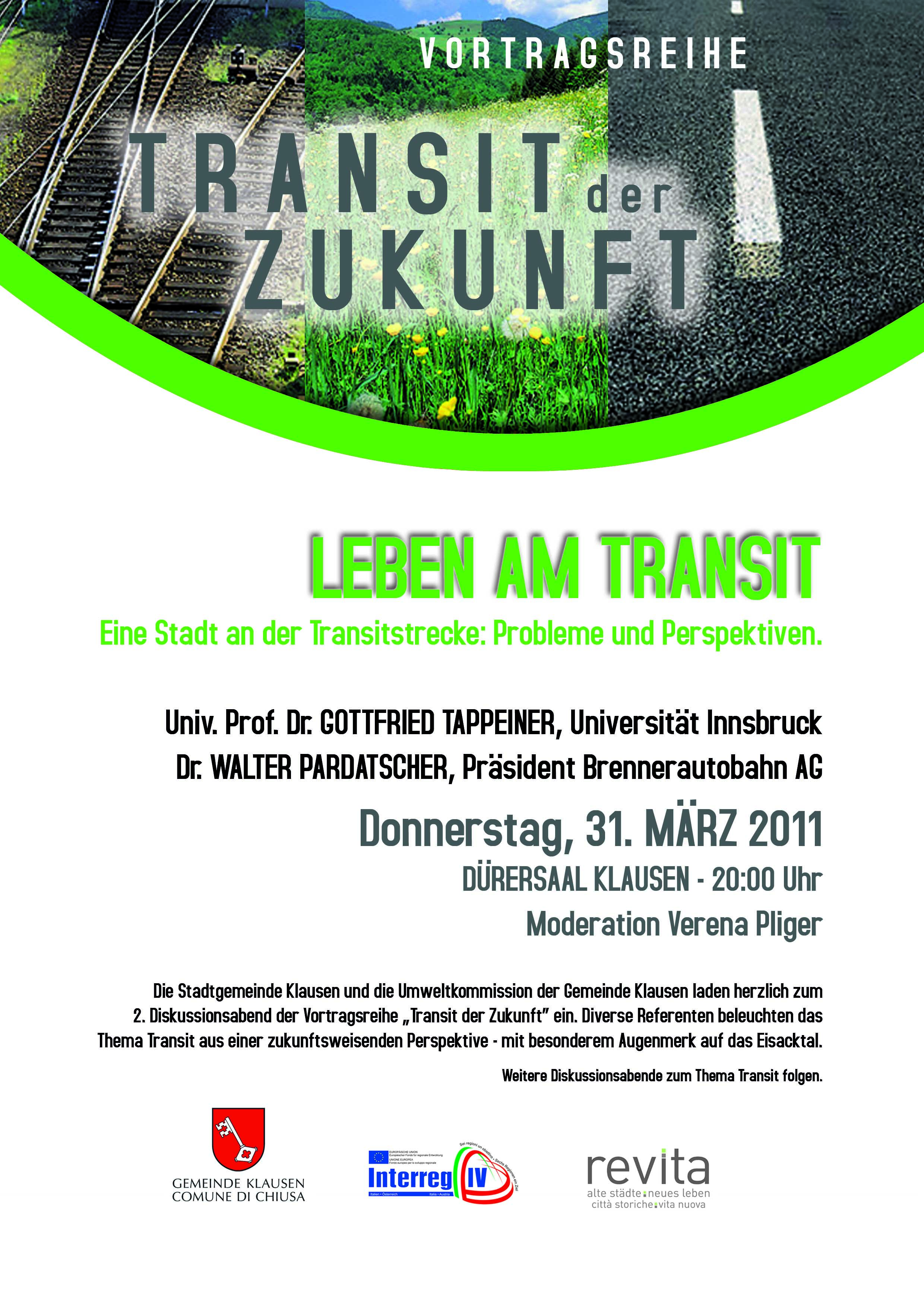 Am 31. März 2011 findet in Klausen die 2. Diskussion der Vortragsreihe "Transit der Zukunft" statt, die ihm Rahmen des Interreg IV Programmes veranstaltet wird. Unter dem Thema "Leben am Transit" werden Dr. Gottfried Tappeiner, Leiter des Instituts für Wirtschaftstheorie, -politik und -geschichte der Universität Innsbruck und Dr. Walter Pardatscher, Präsident der Brennerautobahn AG, über Probleme und Perspektiven des Lebens an Transitstrecken diskutieren. Die Veranstaltung beginnt um 20.00 Uhr im Dürersaal in Klausen. Moderiert wird der Abend von Verena Pliger.