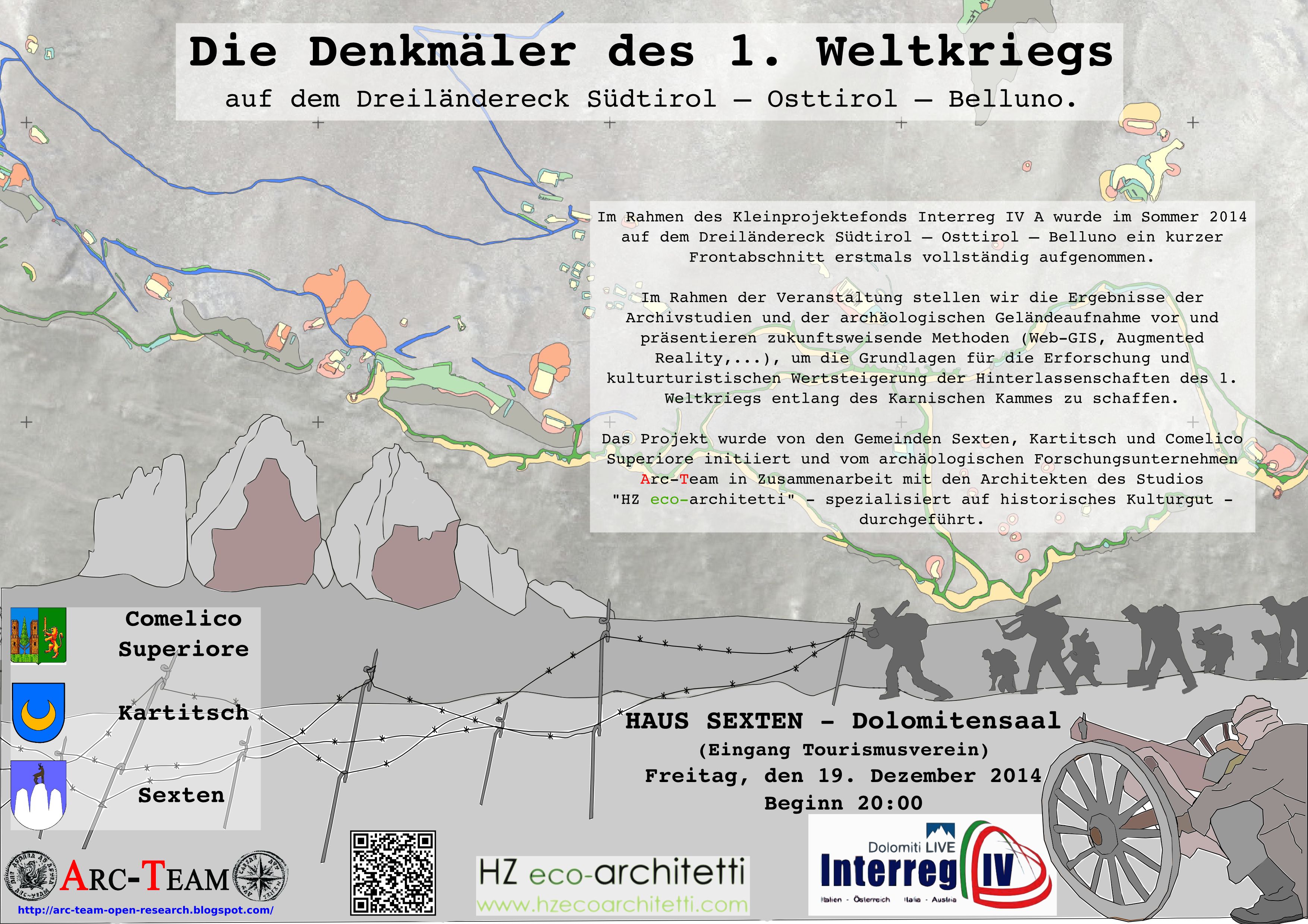 Der Interreg-Rat Dolomiti Live zur Veranstaltung "Die Denkmäler des 1. Weltkrieges" ein, in deren Rahmen die Ergebnisse der Archivstudien und der archäologischen Geländeaufnahmen der Hinterlassenschaften des 1. Weltkriegs entlang des Karnischen Kammes vorgestellt werden.