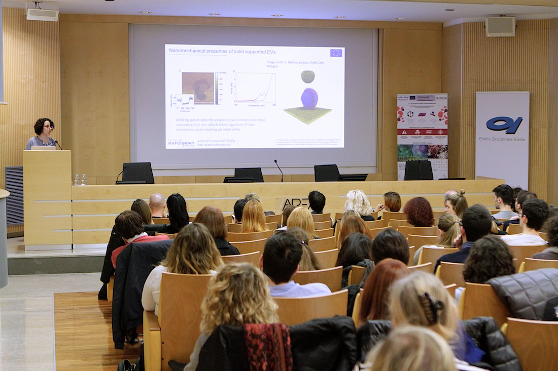 Das Projekt lud am 11. April 2019 zu einem Mini-Workshop zum Thema "Extracellular Vesicles: from biophysical properties to therapeutic applications" nach Padriciano ein. Das Event sah große Beteiligung und inspirierende Diskussionen und bot die Gelegenheit, die Projektergebnisse zu teilen, die im Feld "Extrazelluläre Vesikel" arbeitende lokale Community zusammenzubringen und sich Dank der Teilnahme dreier im EV Feld ausgewiesener Experten (Dr. Lucio Barile vom Cardiocentro Ticino, Dr. Lucia Paolini von der Università degli Studi di Brescia und Dr. Mateja Mancek-Keber vom Slovenian National Institute of Chemistry) als eingeladene Referenten über den Stand der Forschung zu EV Isolierung, Charakterisierung und Anwendungen zu unterrichten. Den Workshop haben mehr als 70 Wissenschaftler aus Forschungsinstituten, Unternehmen und Universitäten aus Triest, Udine, Ljubljana, Nova Gorica, Rijeka, Salzburg, Padua und Rom besucht, die aktiv an den Tagungsbeiträgen teilgenommen haben.