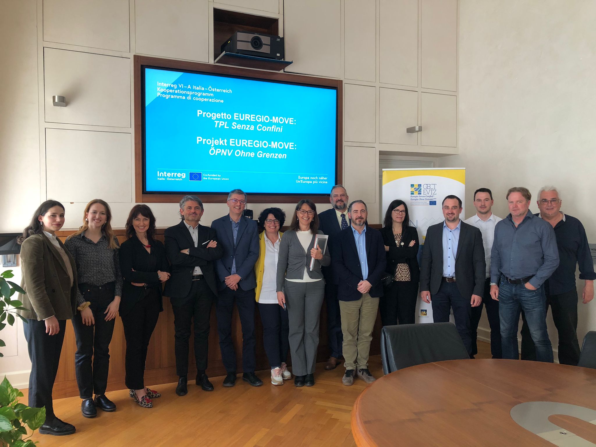 An der Veranstaltung nahmen neben dem Team des EVTZ Euregio Senza Confini, dem einzigen Begünstigten des Projekts, auch Vertreter der drei Regionaldirektionen für Infrastruktur und Mobilität sowie des Verkehrsverbundes Kärnten GmbH teil.