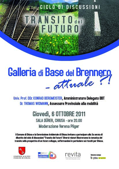 Questi e altri interrogativi saranno al centro della serata di informazione e dibattito organizzata per giovedì 6 OTTOBRE 2011 con la partecipazione dell’amministratore GBB/BBT Konrad Bergmeister e dell’Assessore provinciale Thomas Widmann. L’evento, con inizio alle ore 20:00, si terrà presso la sala Dürer di Chiusa. A presentare la serata, Verena Pliger.