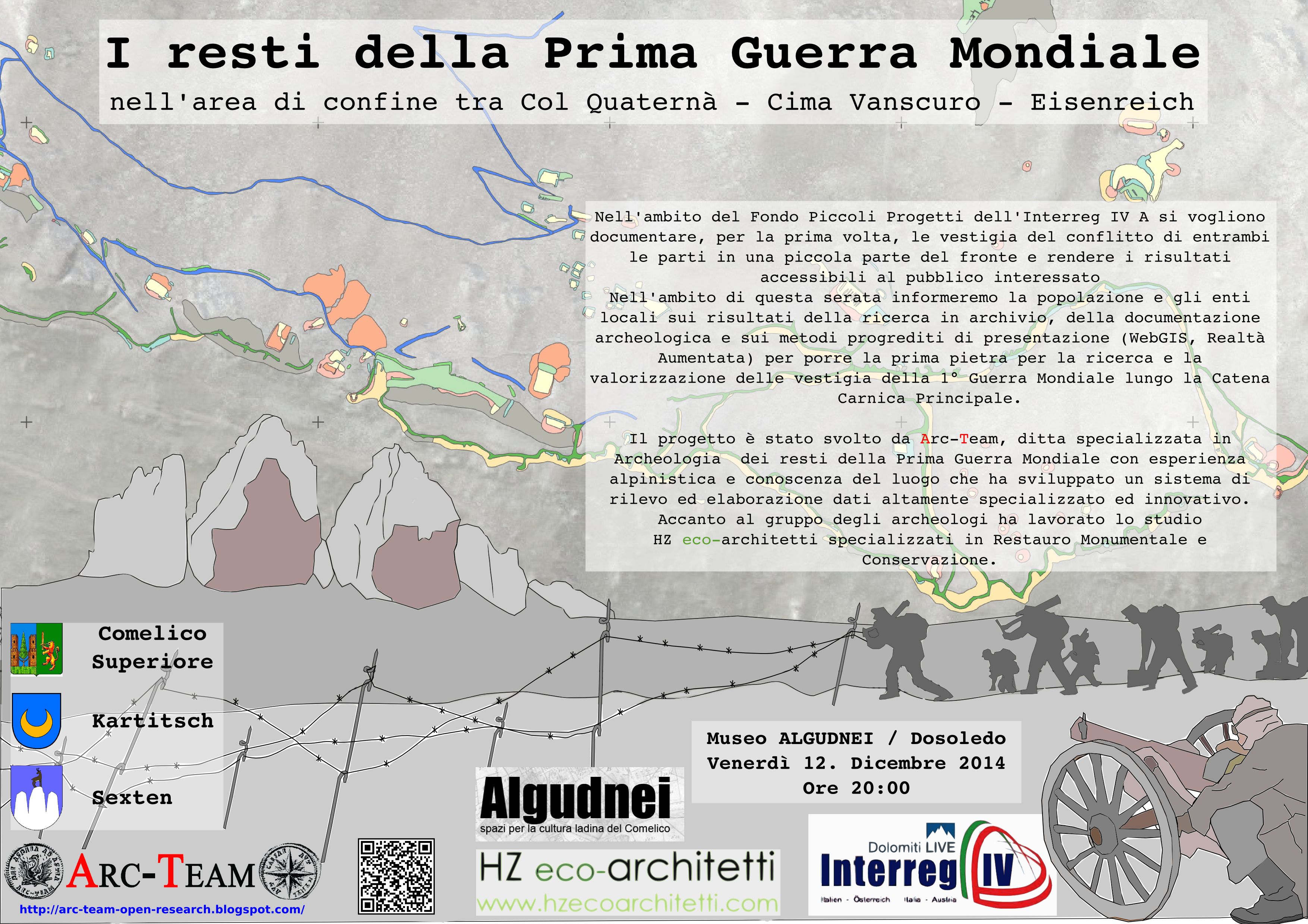 Il consiglio Interreg Dolomiti Live invita alla presentazione "I resti della Prima Guerra Mondiale", nell'ambito della quale saranno presentati i risultati della ricerca in archivio e della documentazione archeologica delle vestigia della 1° Guerra Mondiale lungo la Catena Carnica Principale.