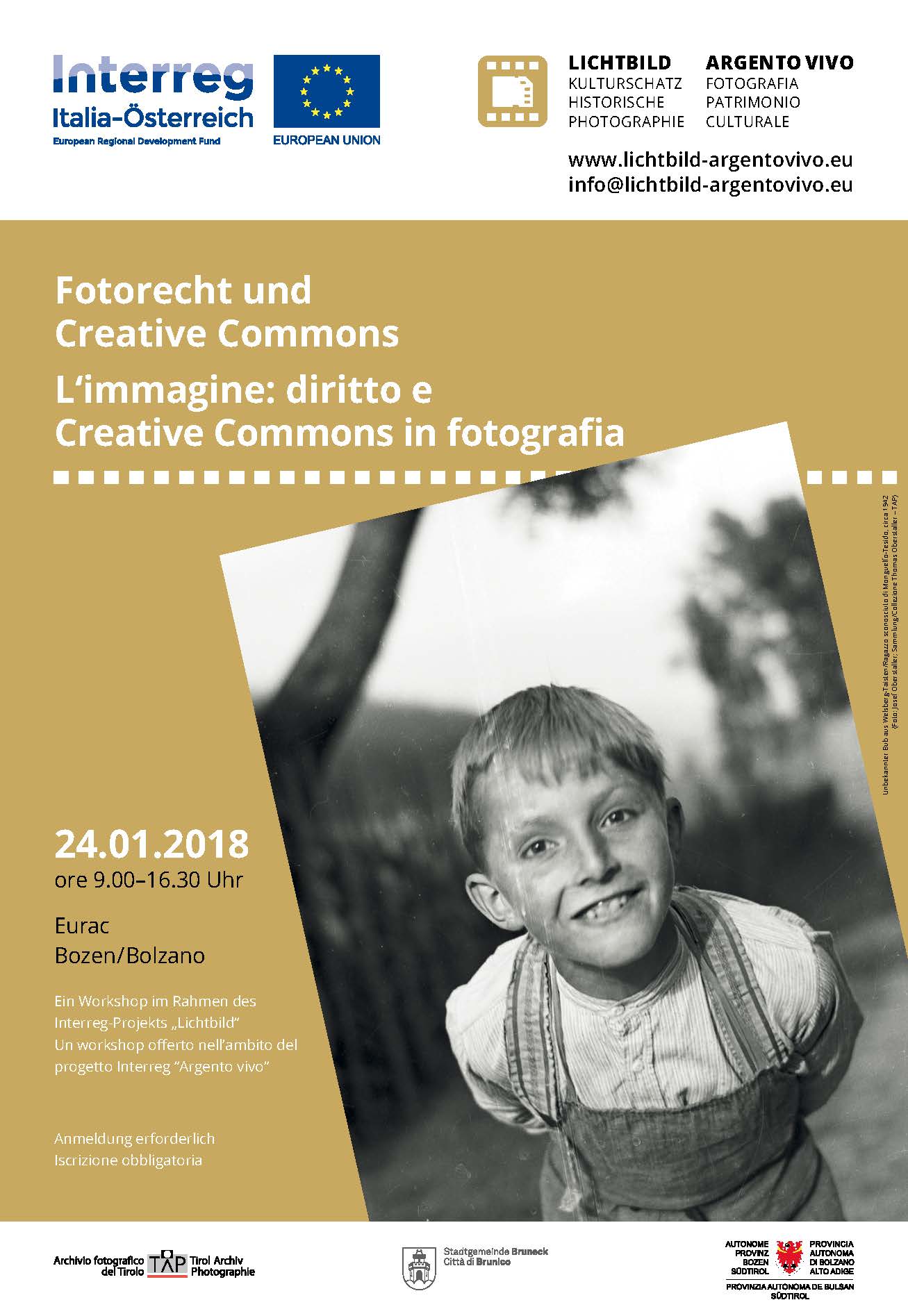 Il progetto invita al Workshop "Diritto e Creative Commons in fotografia", che si terrà il 24 gennaio 2018, presso l'EURAC a Bolzano. Questo convegno affronta vari aspetti di tipo giuridico legati all'immagine fotografica: cosa si può fotografare? Cosa si può pubblicare e dove? Quali sono gli aspetti da tenere in considerazione riguardo a foto tratte da fondi fotografici storici? Quali sono i diritti legati alla propria immagine? A queste e ad altre domande cercheremo di dare una risposta, tenendo conto degli aspetti giuridici dell’ordinamento italiano, austriaco e europeo in generale, con un focus su terminologie come copyright, diritto d’autore, pubblico dominio, creative commons (CC). È inoltre previsto un dibattito con vari esperti e persone che lavorano nel settore.